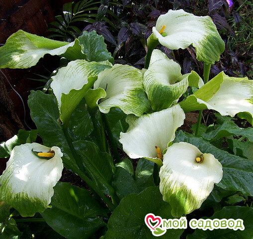 ПОСАДКА И УХОД. Каллы можно выращивать как горшечную культуру, так и садовую. Для посадки каллы подойдет притененный участок. Идеальный вариант, место под негустыми кронами деревьев. Чтобы было достаточно светло, а солнечные лучи не обжигали листьев. Очень эффектно смотрятся каллы, рядом с искусственным водоемом. Отлично цветет и растет только в тепле, где температура не ниже 18°C, самая оптимальная температура 22-23°C. Не переносит сквозняков. Цветоносы этого растения высокие, которые идут прямо от низа растения. На открытом воздухе это прекрасное растение цветет 1 месяц, а в закрытом помещении — 14 дней. Осенью растения сбрасывают листья. На зиму клубни каллы нужно выкопать и хранить в непромерзаемом помещении.